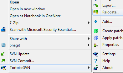 If your repository has for some reason changed it’s location (IP/URL). Maybe you’re even stuck and can’t commit and you don’t want to checkout your working copy again from the new location and to move all your changed data back into the new working copy, TortoiseSVN → Relocate is the command you are looking for. It basically does very little: it scans all