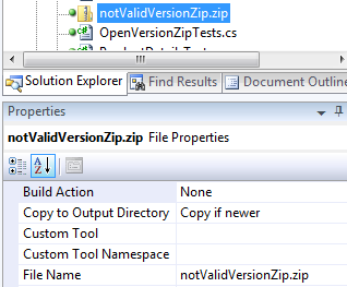 First I use Visual Studio, Copy to Output Directory, to copy the needed file to the output directoy in which your software will be started by the unit tests, e.g. for notValidVersionZip.zip